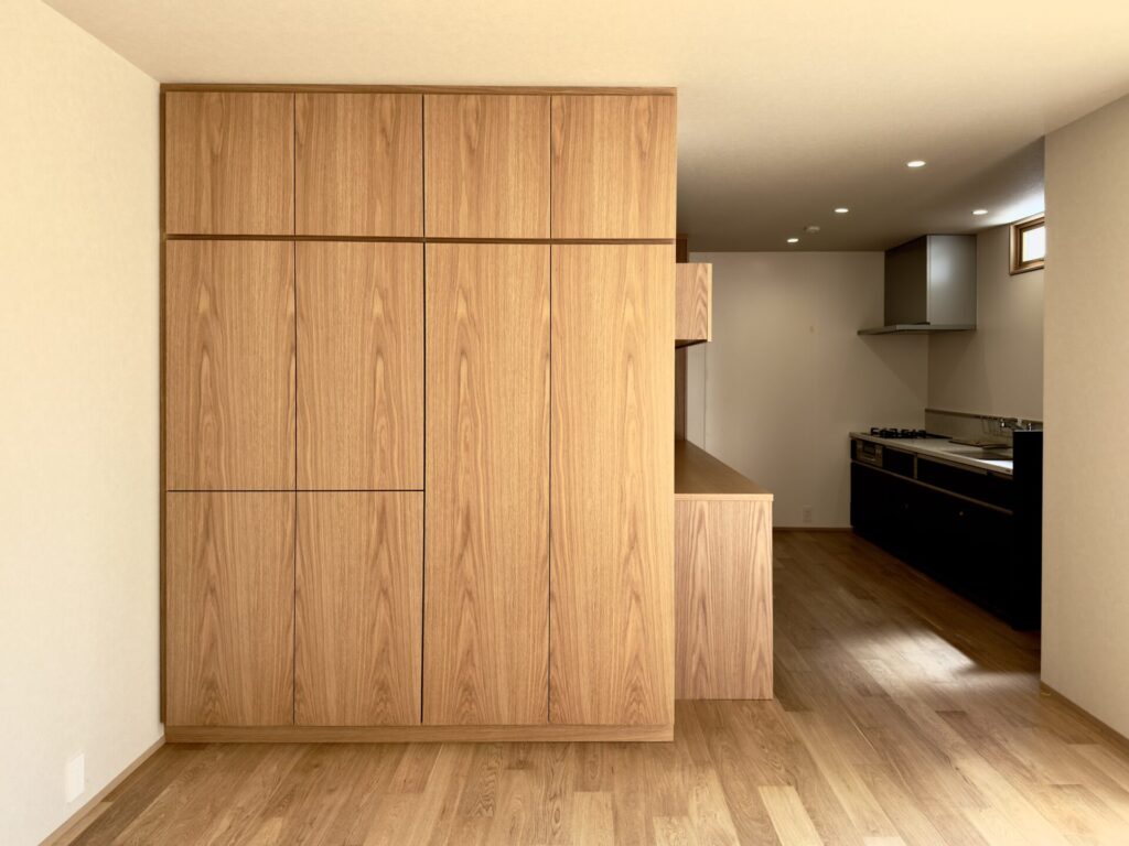 L型キッチンを挟み冷蔵庫・家電スペース・物入れなどもオーダーならではの建物ピッタリに設計させていただいています。
