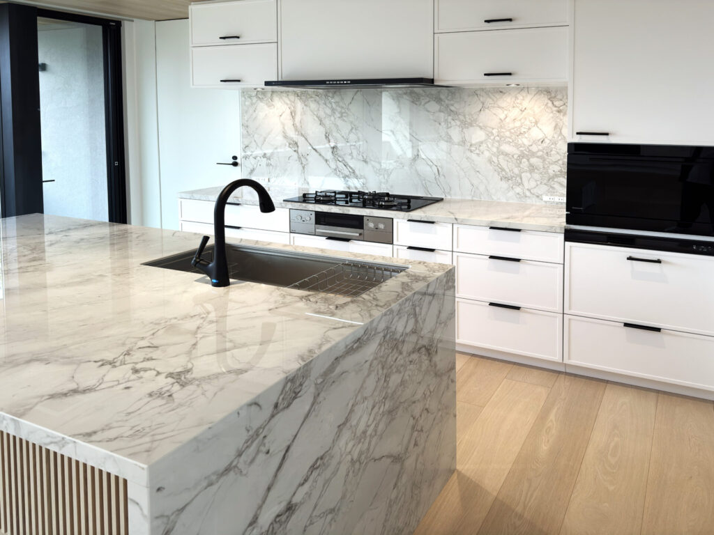 大理石を思わせるホワイトベイン(筋模様)が、キッチン全体をドラマティックに演出。照明によって模様の見え方が変わり、時間帯ごとに異なる表情を楽しめます。 - メンテナンス性