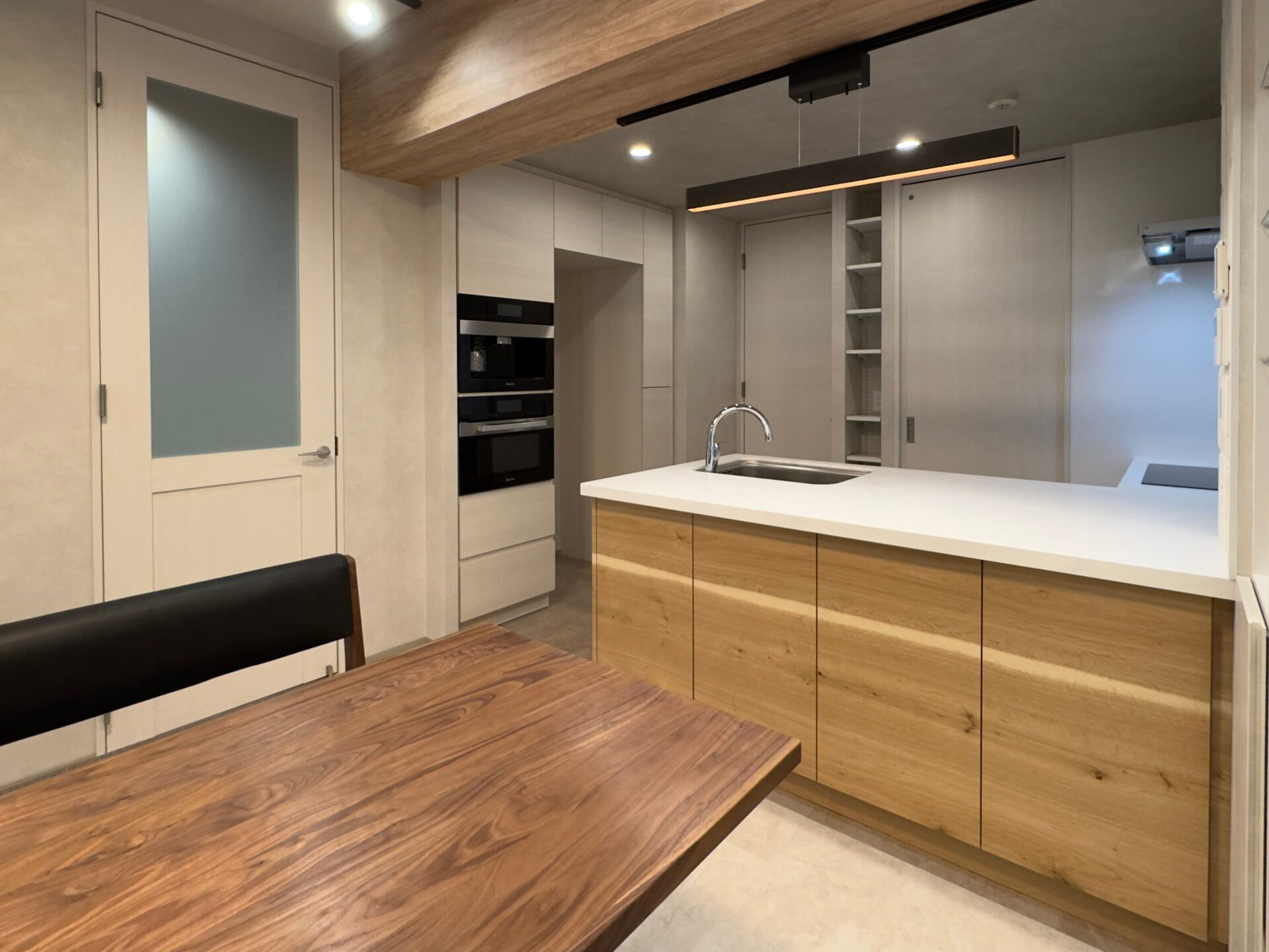 東京中央区のマンションリノベーション事例。ナラ材の突き板「DAISETUZAN」をアクセントに取り入れ、梁や収納まで一体感のある設計を実現。木の温もりを感じるL型キッチンです。