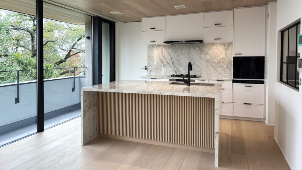 注文住宅に納品した、木製リブMOKRIB「モクリブ」を採用したI型+アイランドキッチン。縦リブの陰影とデクトン天板が、ナチュラルモダンな空間を演出します。
