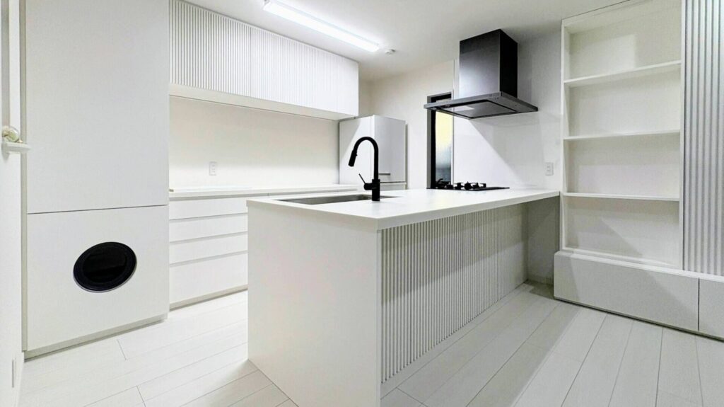 ホワイト リブパネルをアクセントにしたモノトーンなキッチン