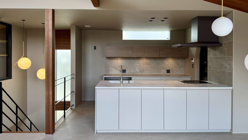 空間と調和するグレージュトーンのオーダーキッチン。落ち着きと洗練を両立した長く愛せるデザイン。