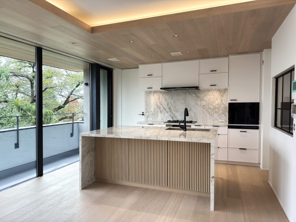 渋谷区のマンションに設置したオーダーキッチン。施主様のご要望は「モダンで洗練された空間」。そこでアイランドに「マルキーナ」を採用しました。