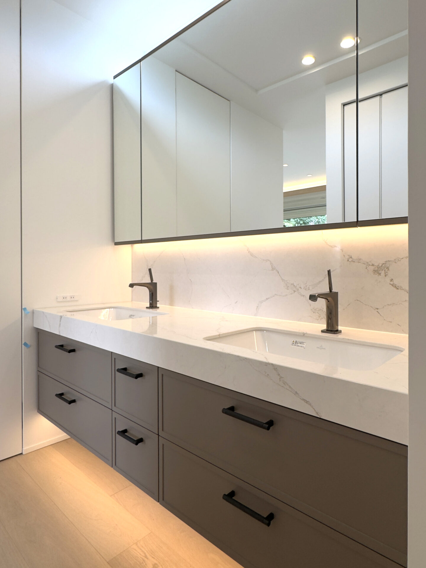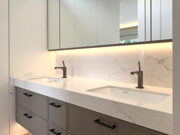 間接照明付きの光るミラーを採用したオーダー洗面台。ホテルのような上質さを日常に取り入れた施工事例です。