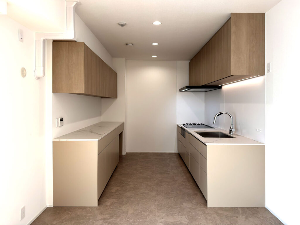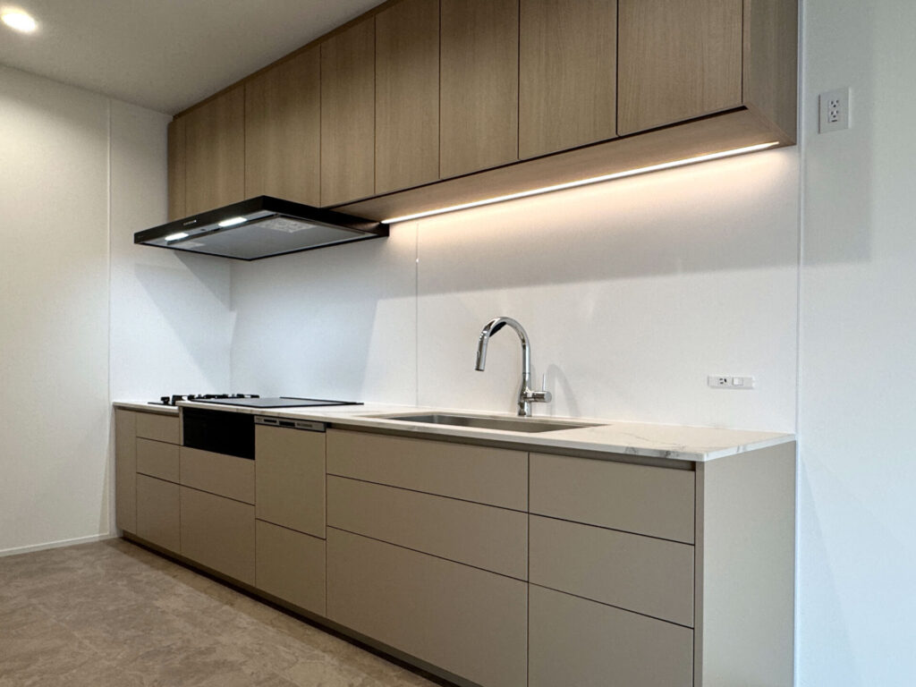 空間全体をすっきり見せるため、扉材には落ち着いたグレージュ系マット面材を採用し、上質で静かなトーンに仕上げています。