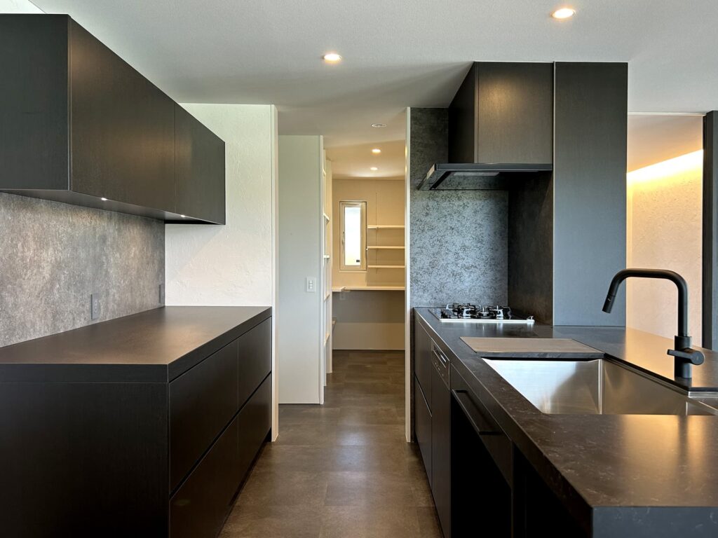 ブラックで統一したI型+ペニンシュラ。素材感を活かした、モダンで洗練された印象の施工事例です。